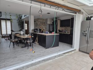 Réalisation d’une ouverture sur mur porteur et installation d’une baie vitrée coulissante aluminium à Clermont-de-l’Oise pour relier la cuisine à la véranda par l’entreprise de Maçonnerie kreabati. Intervention dans une maison...